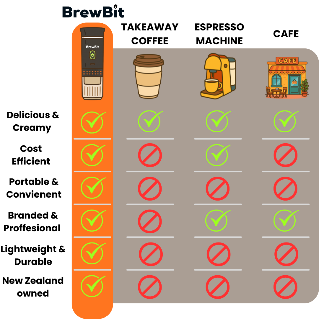 BrewBit Portable Espresso Machine is the only choice for coffee lovers who want quality and convenience without the ongoing cost of takeaway coffee. Not only does it save money in the long run, but it also gives you full control over your brew-anytime, anywhere. BrewBit is compatible with ground coffee as well as widely recognized small and large capsules. Including Nespresso Original, Nescafé, L’OR, Starbucks, Tuatahi Coffee and many more. Whether you’re at work, traveling, or outdoors, you can enjoy fresh, barista-style coffee without waiting in line or compromising on taste.